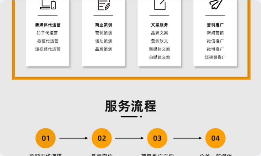 1 运营服务 根据产品或方向确定粉丝方向 - 生成运营方案 2 受众分析 筛选特定人员和受众人群 3 对接沟通 建立对接工作群配置人员 4 运营指导 合作期限内账号所有运营 生成运营方案 5 操作指导 起号、yang号、登录数据查看等运营指导 6 创意指导 提供创作指导建议确定脚本、剧本方向 7 账号定位 整体帐号定位打造标签 8 人设分析 确定人社分析明确帐号人